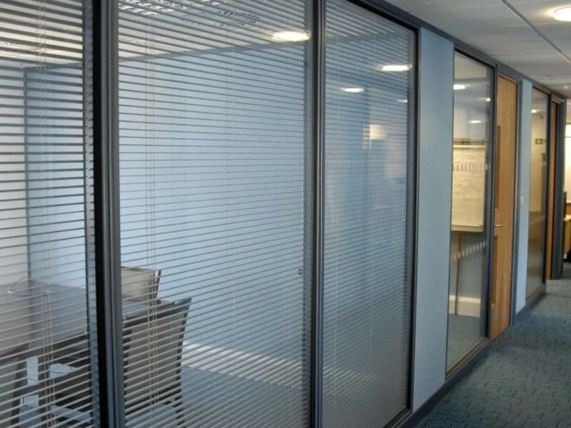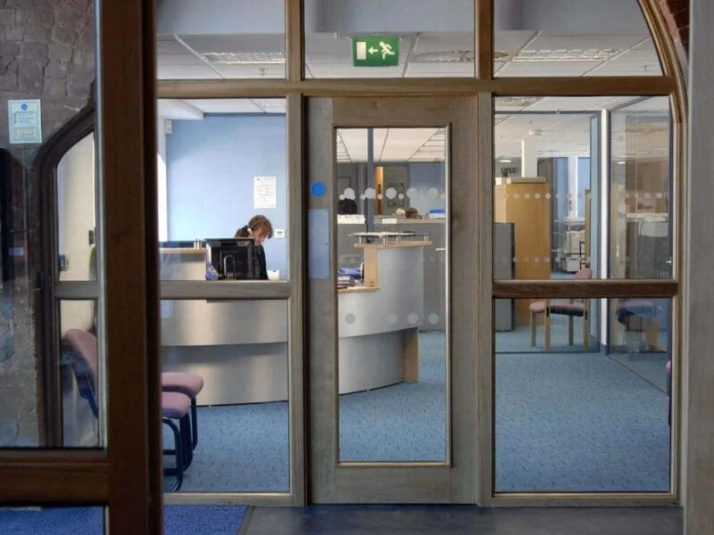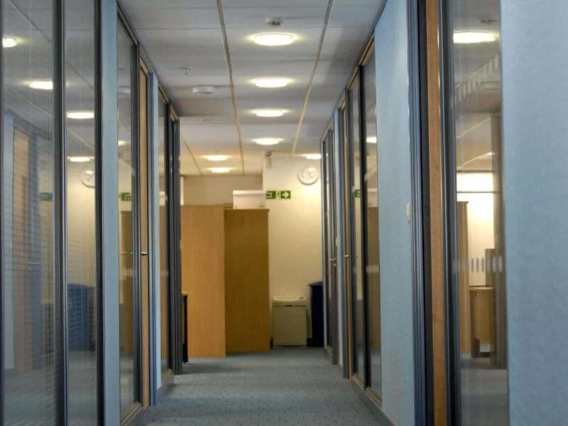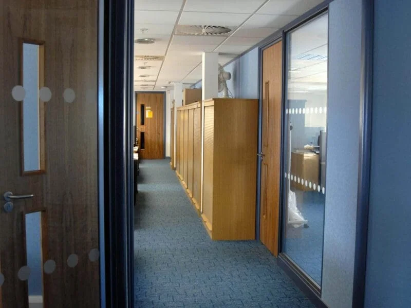 Once the plans, designs and proposed products were approved, the interior of the 100,000 sq.ft three-storey office block was stripped back to its original structure, lined out and insulated to meet building control requirements and prevent energy wastage via heat gain or loss. The offices were fitted out with stylish glazed partitioning, integral blinds, veneer doors and suspended ceilings.